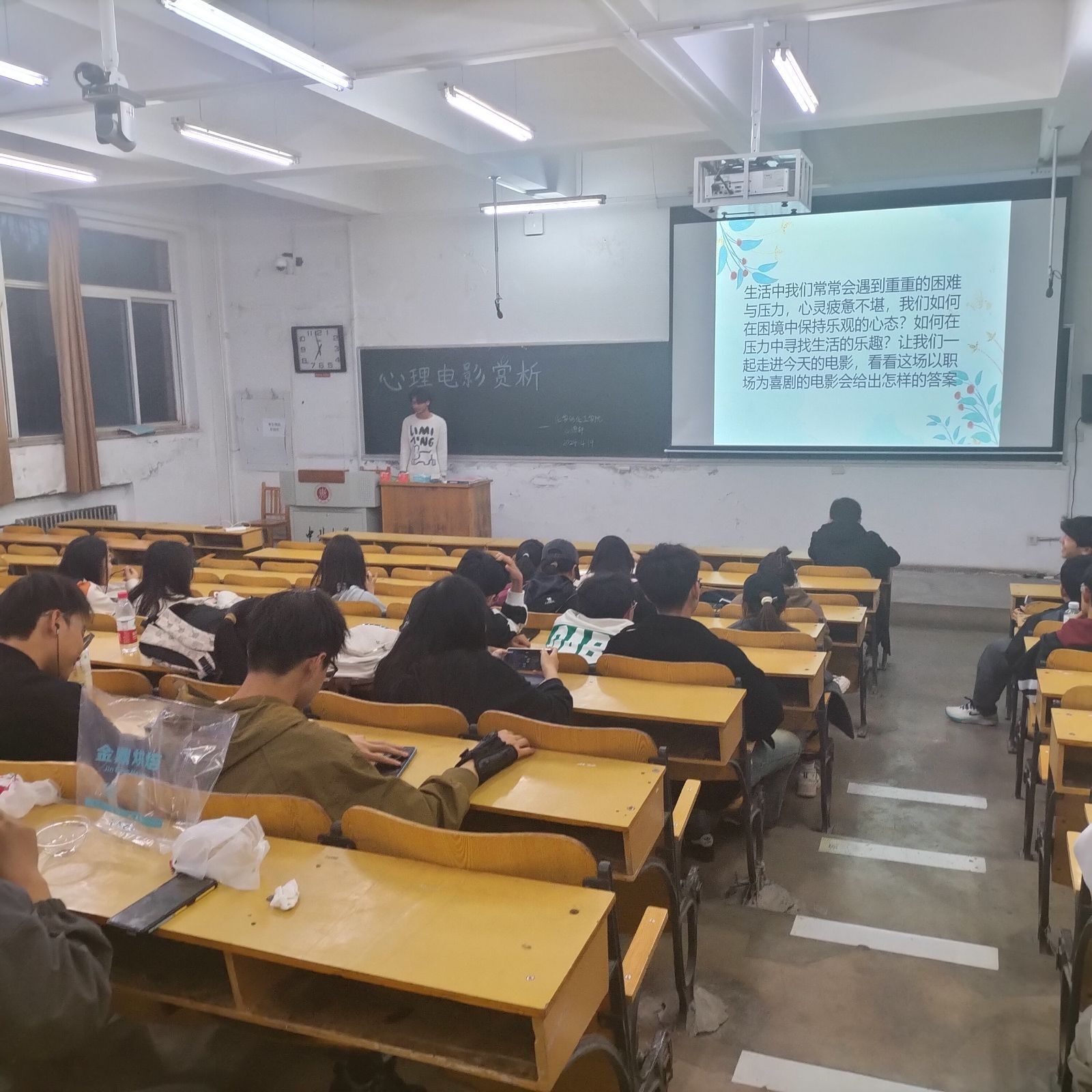 为了传递热爱生活的生活理念,鼓励同学们坚守初心与梦想,我院心理辅导站心语轩于2024年4月19日晚19:00在10102H播放了本学期第二场心理电影一《年会不能停》。