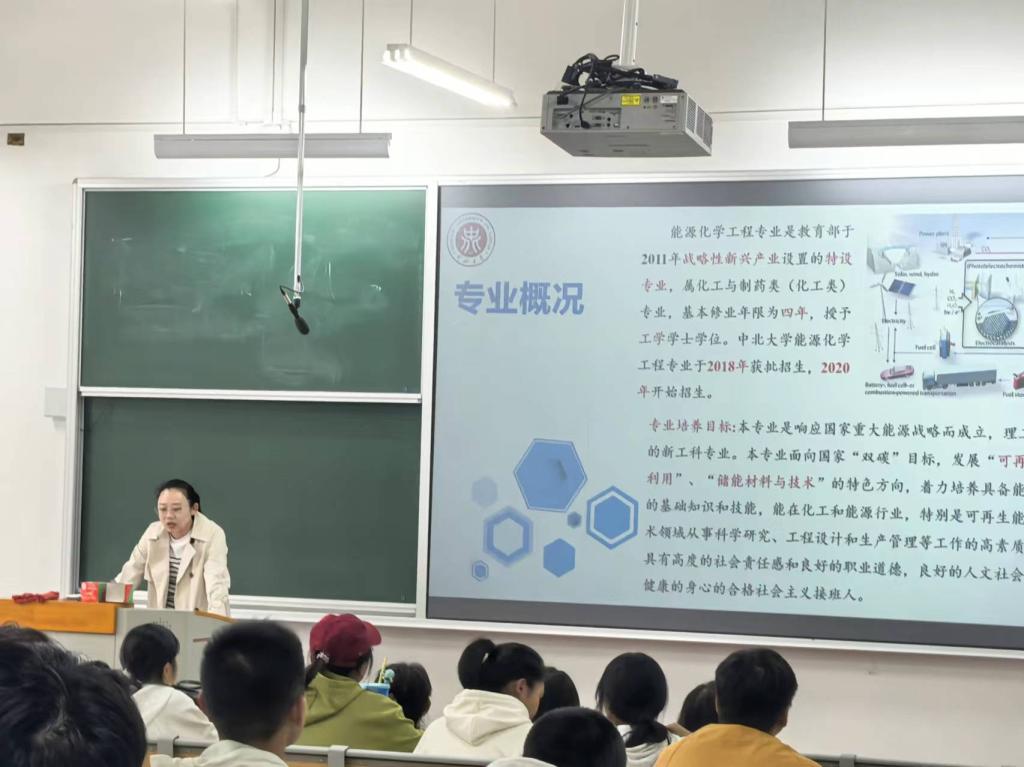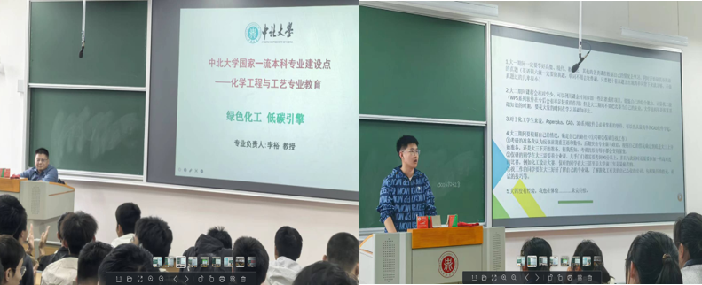 化学工程与工艺讲座中,李裕老师向同学们讲述了中北大学化工专业的发展历程和前景、化工专业与化工学科的区别以及化工专业的两大特色等内容,强调了化工产业由传统到绿色新型的转变。同时,21级优秀在校生成佳璐、孙鹤文、成逸申、马艺博四位同学分享了自己对化工专业的理解及学习心得。