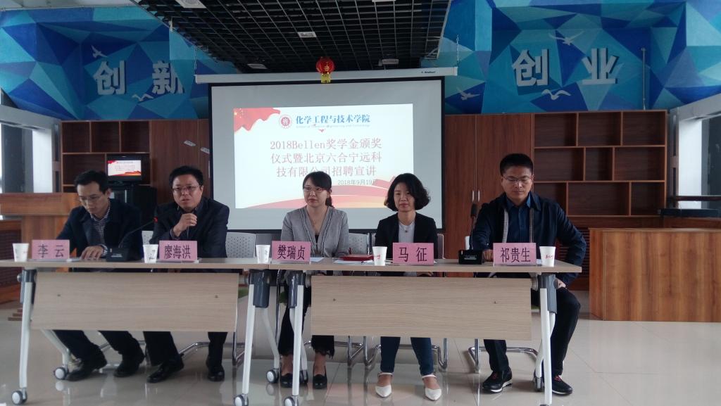 2018年9月19日下午2:30,化学工程与技术学院-Bellen奖学金颁奖仪式我院办公楼科学楼七层连廊举行,北京六合科技有限公司总裁助理公樊瑞珍、人事部经理马征,院党书记廖海洪,院长祁贵生出席颁奖仪式,会议由院党委副书记李云主持。