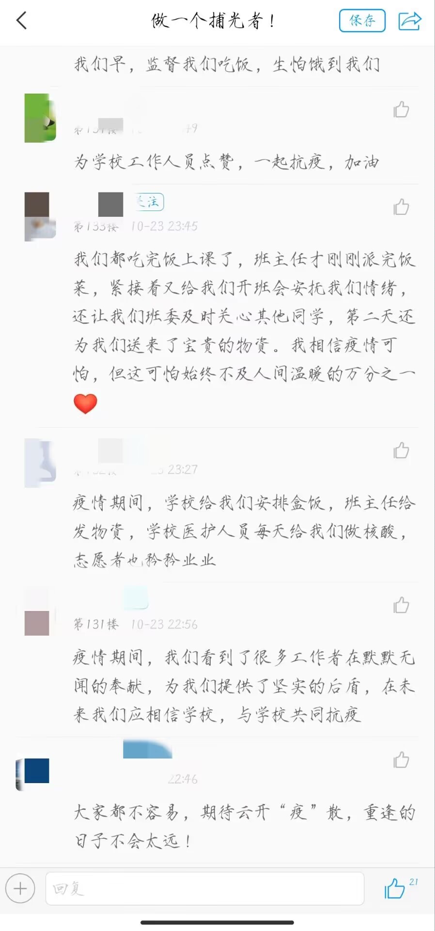 自19日采取线上自主报名后,同学们积极参与其中。虽然疫情仍然存在,但它始终无法影响我们万众一心的意志和积极向上的心态。活动期间,同学们通过回答问题以及共同探讨的方式互相分享自己的经历与看法,同时也表达了对我校的领导、老师及工作人员在疫情期间工作的理解和感激!