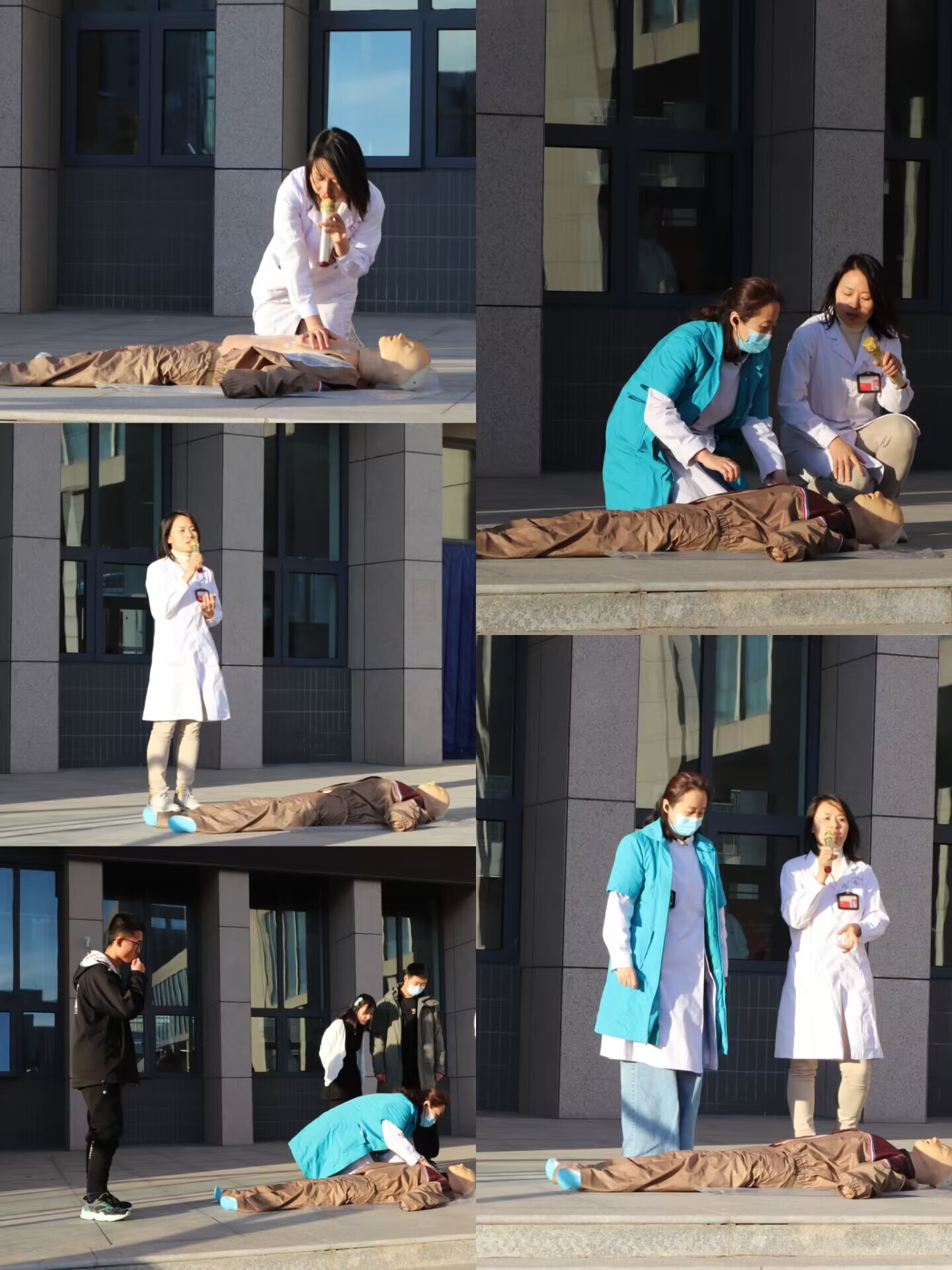 全体师生疏散至集中地点后,邢丽霞大夫讲解了安全急救知识,张慧护士长演示了心肺复苏的操作流程,并提醒注意事项。有三位学生参与心肺复苏实操练习,大夫耐心地指导,使实操学生掌握了心肺复苏技能。