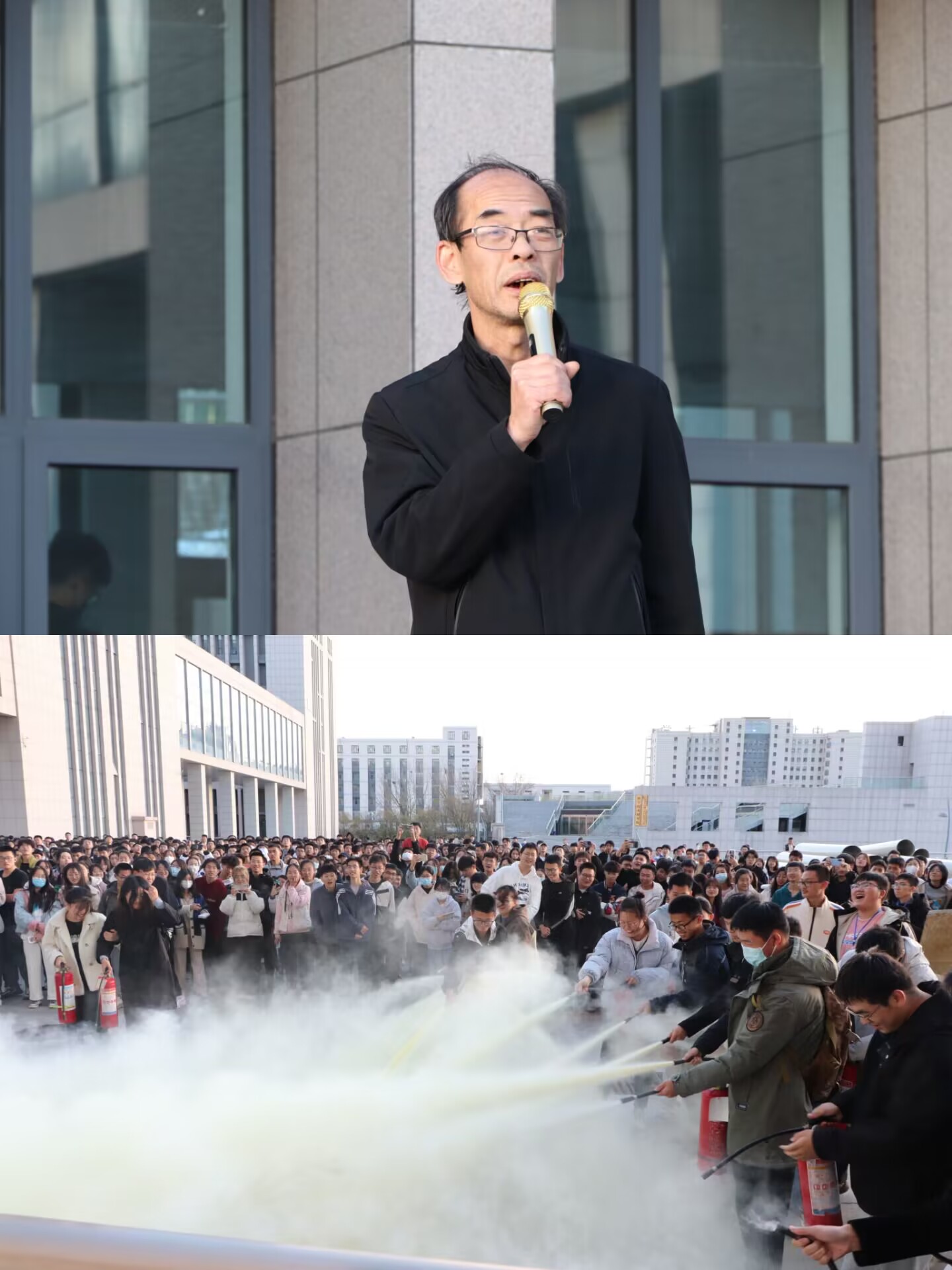 最后,史志强科长讲解了灭火器使用方法。有学生代表进行实际操作,面对熊熊燃烧的火堆,他们表现得积极勇敢,按照正确的灭火步骤迅速将火扑灭。