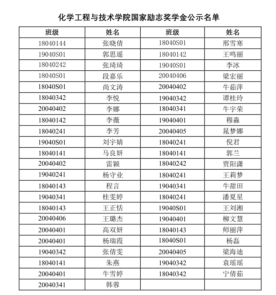 根据中北大学《关于做好2020/2021学年国家励志奖学金评定工作的通知》,化学工程与技术学院通过自愿申报,按综测、绩点、体测三项打分排队,经过院级评审会的评议,最终,评定出以下45位同学获得国家励志奖学金,现予以公示,公示期2021年10月12日至14日,若有异议,请联系王志强老师,电话15536848660。