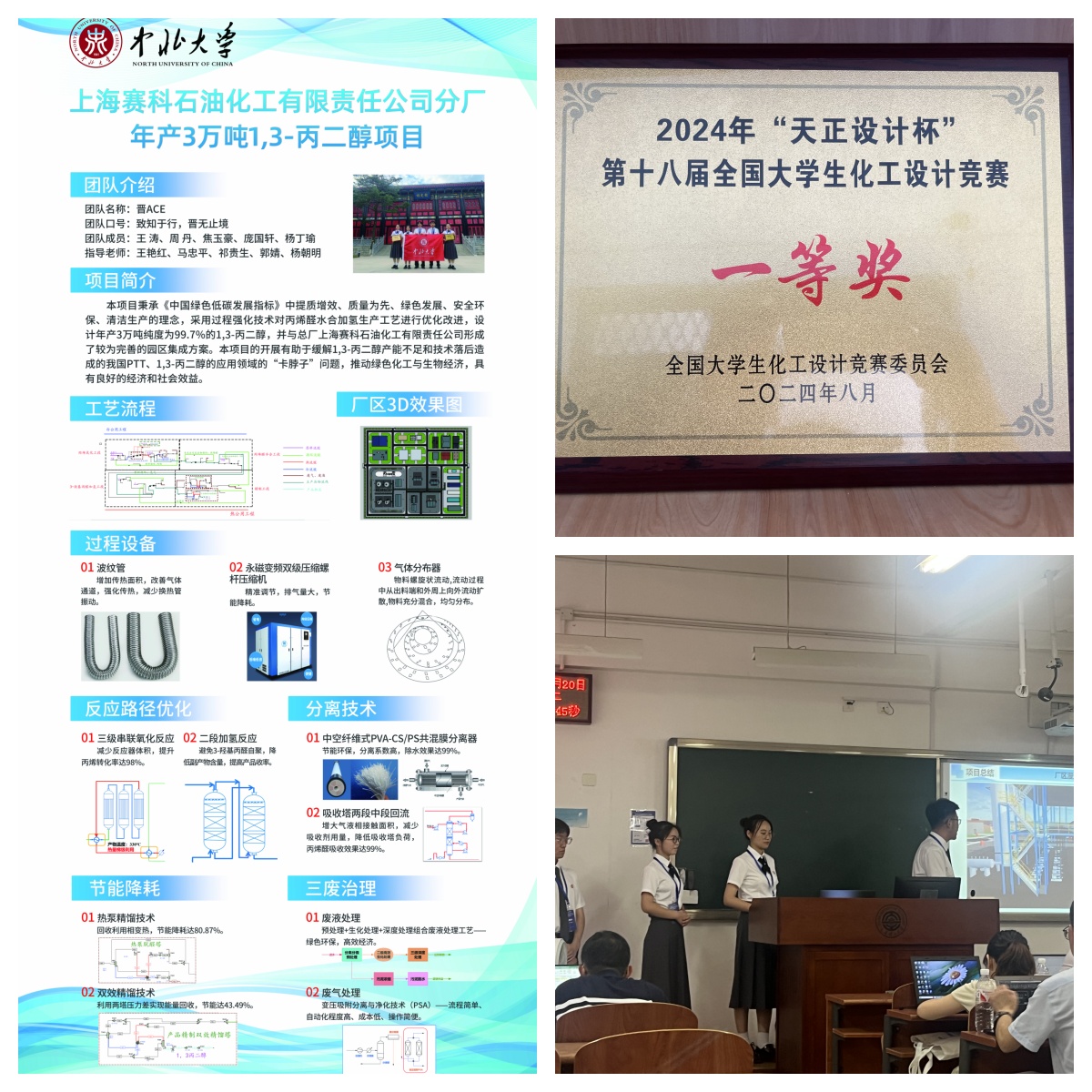 2024年8月16至22日,“天正设计杯”第十八届全国大学生化工设计竞赛全国总决赛在大连理工大学举行。我校美高梅mgm1888公司官网“晋ACE”团队(美高梅mgm1888公司官网2021级化工专业本科生王涛、焦玉豪、周丹、庞国轩、杨丁瑜5位同学组成)完成的作品——“上海赛科石油化工有限责任公司分厂年产3万吨1,3-丙二醇项目”,在工艺选择、设备设计与选型、自动控制、本质安全、清洁生产、三维工厂等方面开拓创新,精彩的汇报展示与答辩得到了评委的一致认可,历经山西省省赛、西北区赛、全国总决赛,从全国450所高校,3685支队伍中,一路拼搏,最终获得西北赛区特等奖、全国总决赛一等奖,并获西北赛区工程图纸与设计文档优秀奖。这是我校自参加全国大学生化工设计竞赛以来,已连续11年代表西北赛区参加全国总决赛,并获得全国一等奖,这一优异成绩体现了美高梅mgm1888公司官网在人才培养和学科建设方面的工作成果,也彰显了中北大学在化工本科教育领域的引领地位。