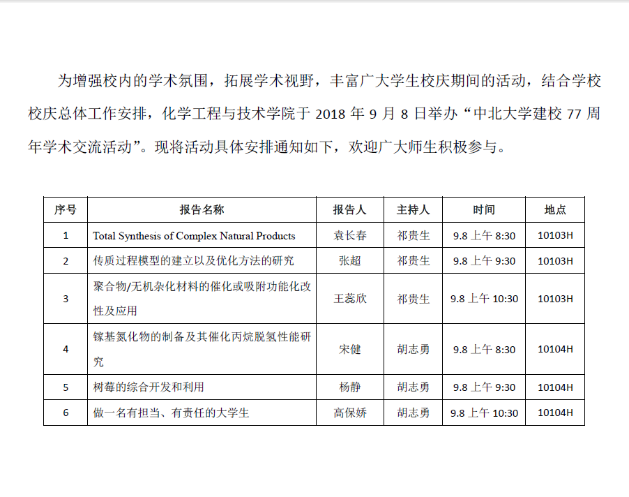 化学工程与技术学院关于举办2018年校庆学术活动的通知