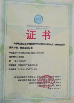 经过我院生物工程专业参赛人员及指导老师的不懈努力,在“第四届全国大学生生命科学创新创业大赛”中荣获佳绩,我校三个作品参赛,共荣获二等奖1项,三等奖2项。其中刘凯等六人凭作品“吸附树脂接枝刷对迷迭香酸的吸附性能研究”在比赛中荣获创新类二等奖(创新类),指导教师为史楠、郭建峰。李静等五人凭作品“一种用于沙棘黄酮检测的试剂盒及沙棘黄酮检测的方法”荣获创新类三等奖,指导教师为王海滨、王芳。寇君等五人凭作品“酶辅助火麻蛋白提取工艺的研究”荣获创新类三等奖,指导教师:李晓军。