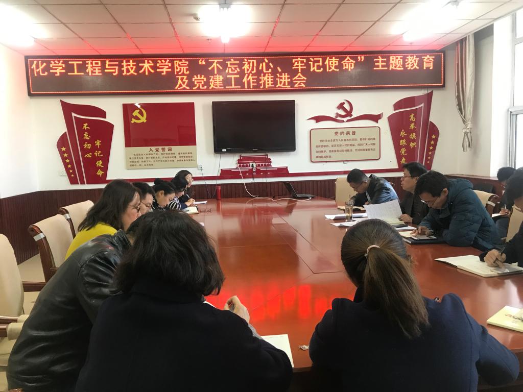 2019年11月11日,化学工程与技术学院在党员之家召开“不忘初心、牢记使命”主题教育工作部署会及党建工作推进会,学院领导班子成员以及各支部书记参加会议,学院党委书记廖海洪主持会议。
