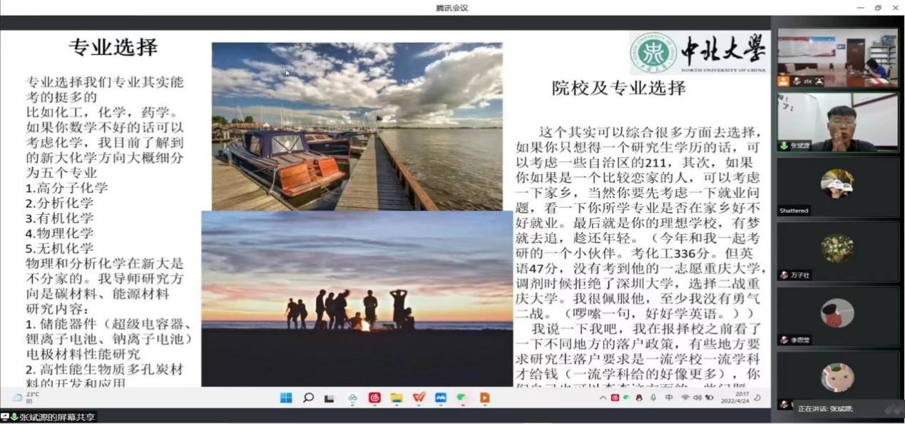 为充分发挥教工党支部在学生学业、考研方面的引导作用,帮助在校学生尽早规划自己学业、合理树立考研目标,推进学院升学就业工作。2022年4月24日,化学工程与技术学院制药工程系教工党支部联合制药工程系学生党支部通过腾讯会议召开线上考研经验分享会,邀请七名制药工程专业2022届优秀学子作为嘉宾分享考研经验。分享交流会议由秦秀峰老师主持,院党委书记廖海洪老师、制药工程系教工党支部全体党员参加会议,制药工程专业全体学生参加了此次交流活动。