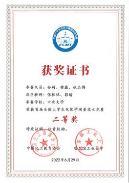2022年7月9日,首届全国大学生电化学测量技术竞赛(ECMT竞赛)决赛颁奖日胜利召开。本次竞赛由中国化工教育协会和哈尔滨工业大学联合举办,共有来自清华大学、哈尔滨工业大学、厦门大学、北京航空航天大学、大连理工大学等118所院校的690支队伍、1700余名同学报名参赛。我校代表队表现优秀,获得了全国第三名的优异成绩,张栋铭教授荣获优秀指导教师称号,孙同同学作为学生代表在颁奖典礼上进行发言。