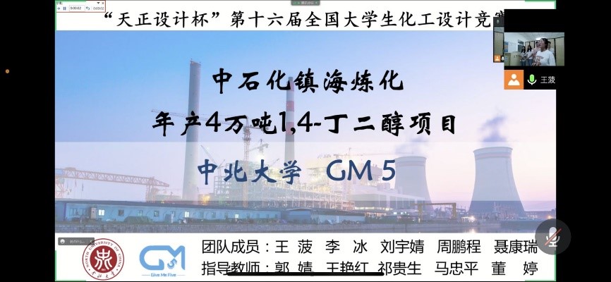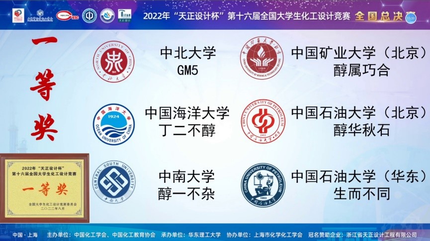 2022年“天正设计杯”第十六届全国大学生化工设计竞赛全国总决赛由华东理工大学承办,于2022年8月16~22日以线上形式举行。经过赛区预选赛,遴选出60支队伍参加全国总决赛。美高梅mgm1888公司官网“GM 5”团队,一路过关斩将,以西北赛区第一名的优异成绩代表西北赛区参加了全国总决赛,并获得全国一等奖,这是我校连续9年代表西北赛区晋级全国总决赛并获奖。