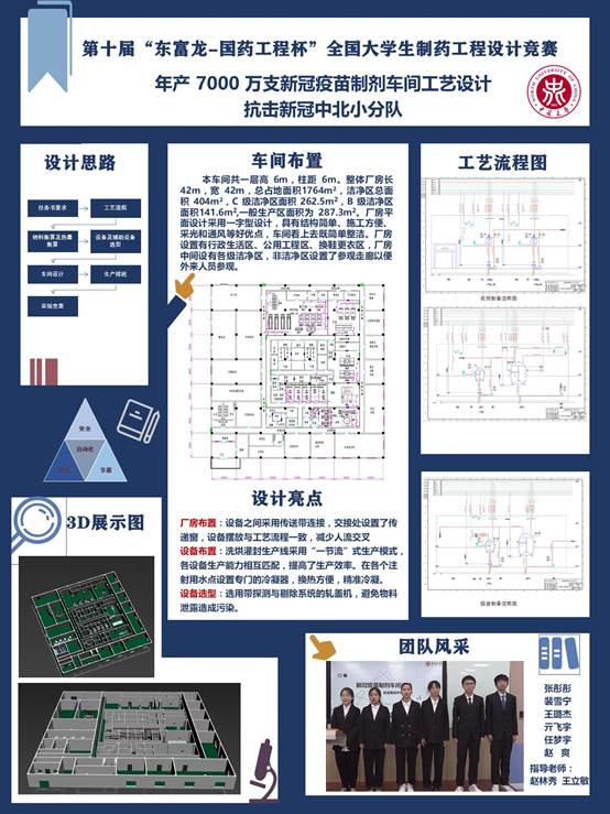 本次竞赛题目为“年产7000万支新冠疫苗制剂车间工艺设计”。全国共有138所高校的540支队伍提交参赛作品,经大赛专家委员会全匿名评审,择优筛选出20支队伍参加全国总决赛。我院“抗击新冠中北小分队”入围全国总决赛,全体成员发挥团队精神,奋勇拼搏,最终荣获得全国二等奖,在国内同行专家和高校面前展现出我院学子良好的精神风貌。