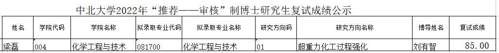 2022年化学工程与技术学院“申请——考核”制博士研究生复试成绩公示如下,公示3天,如有异议,请致电学院科研科0351-3924572.
