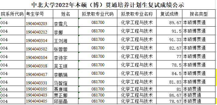 中北大学化学工程与技术学院2022年本硕(博)贯通培养计划生复试成绩公示如下,公示三天,如有异议,请致电科研科3924572.