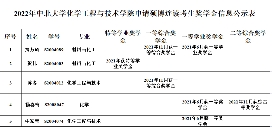 2022年中北大学化学工程与技术学院申请硕博连读考生奖学金信息如下表所示,公示三天,如有异议,请致电科研科3924572.