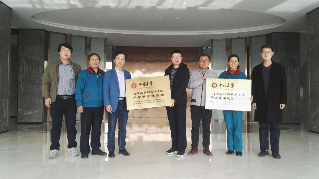 2018年11月29日上午,“中北大学化学工程与技术学院产学研合作基地”和“中北大学化学工程与技术学院研究生实习教育基地”在山西新天源医药化工有限公司正式挂牌成立。公司总经理苏蔚带领企业相关负责人与我院副院长胡志勇带领的药物绿色合成创新团队一起参加了挂牌仪式。山西新天源医药化工有限公司是专业生产医药中间体的高科技民营企业,公司从事医药中间体的研制、开发、生产已有20余年的历史。公司集研究、开发、生产、进出口贸易为一体,技术力量雄厚,检测手段先进,拥有强大的研发能力和精湛的合成技术,是山西省高新技术企业、山西省首批创新型试点企业。