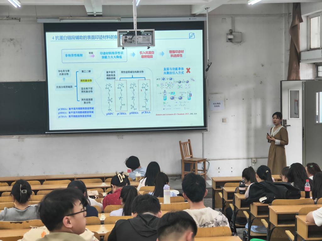 蛋白质的高效识别与分离可以为蛋白质药物研发、蛋白质组学研究和疾病诊断等提供关键的技术支撑,是生命科学研究中的一个焦点。为了开拓学生的学术视野,我院于2024年5月16日下午3点在10101H教室举办了主题为“选择吸附增强型表面蛋白印迹纳米材料的构筑与应用”的学术讲座,本次讲座由吕燕婷老师主讲,学院研究生参加了此次讲座。