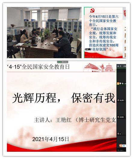 维护国家安全,保守国家秘密,是每位公民应尽的基本义务,今年4月15日是第六个全民国家安全教育日,博士研究生党支部书记王艳红老师讲了“光辉历程,保密有我”为主题的党课,主要讲述了什么是国家安全、国家安全教育的主要内容以及全民国家安全教育日的由来,还有每位公民在维护国家安全中的权利与义务、生活中应警惕危害国家安全的活动以及发现国家秘密已经或可能泄露时应当采取的措施。参会的老师与同学们结合自己在科研、学习与生活中遇到的涉及国家安全、科研保密等问题进行了讨论交流。